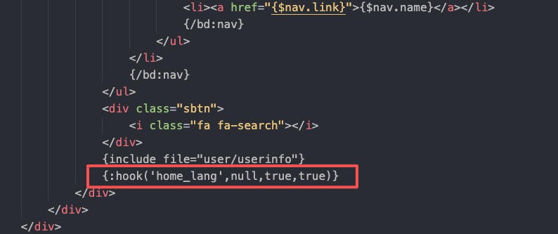 {:hook('home_lang',null,true,true)}很简单,一行代码就可以,如下图。