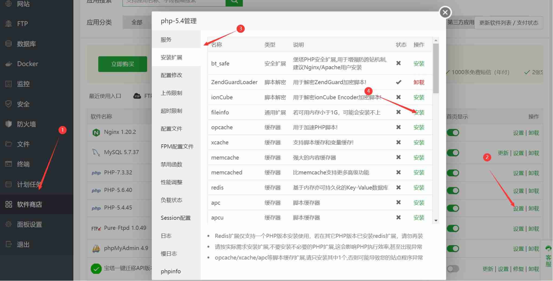3、找到fileinfo,点击安装,稍作等待,安装完成之后上传就没问题了
